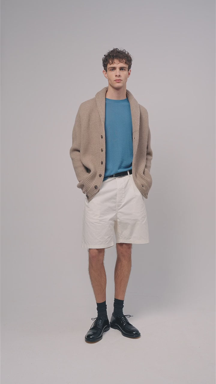 Wrap up in 8ply sumptuously soft cashmere, handcrafted with a double-layer shawl collar, saddle shoulders, and horn buttons. Take a cue from the iconic Steve McQueen: style yours over a denim shirt and chinos, and turn the collar up over a turtleneck for an extra cosy fit.