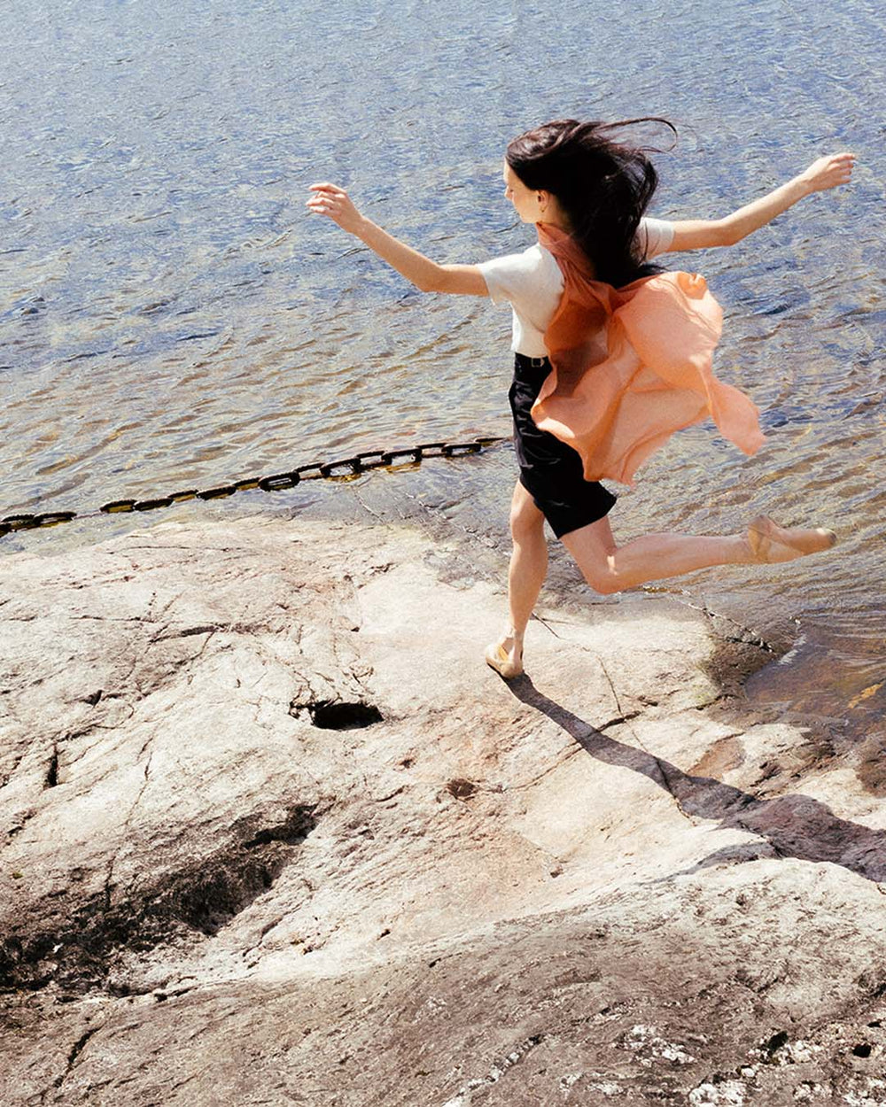 Inspired by the grace of ballet, the scarf becomes an extension of the dancers body, weightless, expressive, and elegant. Set against cinematic Scottish landscapes, it responds to the elements, moving like poetry in motion, brought to life in bold, expressive colours.