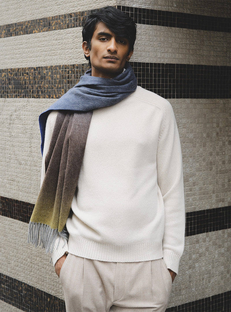 With a seamless transition of colour, the Nuance is entirely unique to Begg x Co. Its remarkable appearance is due to the skill and mastery of innovative spinning techniques. This traditional method creates the subtle, gradual blending of shades from fringe to fringe, and is available in two different finishes – a washed, lightweight plain weave for a casual look, or with a glossier rippled effect, the result of gentle brushing with Italian teasels.