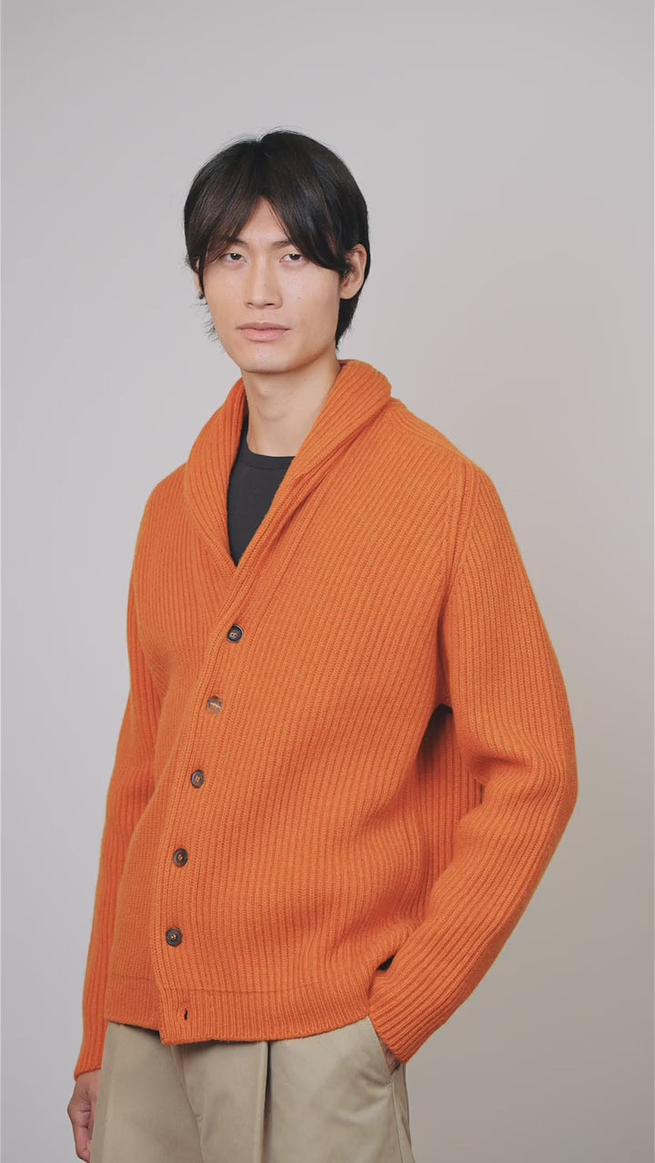 Feel at home wherever you are in the timeless shawl collar cardigan, made from soft yet substantial 8-ply Scottish cashmere. A chunky ribbed design and flattering face-framing collar make it the ideal knit to layer under big winter coats, while horn buttons and a saddle shoulder design give it a polished, academic feel.