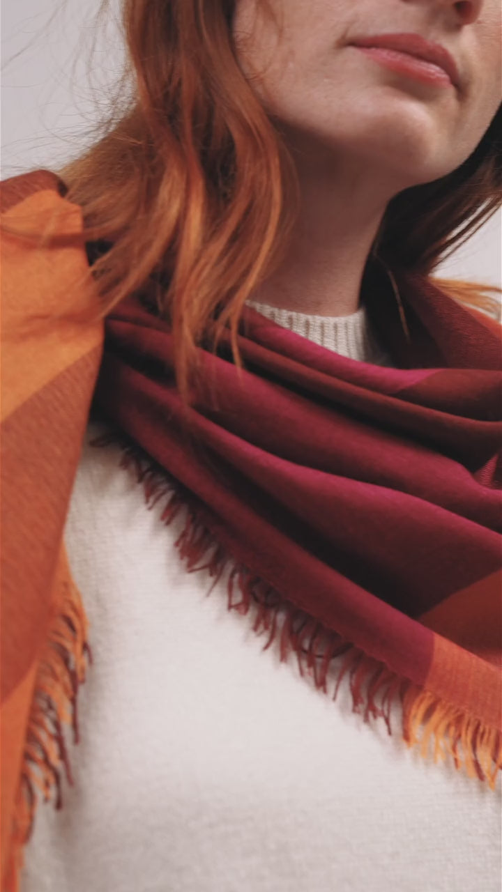 The Staffa Ottilie’s liquid-like sheen and semi-sheer finish is a result of a balanced blend of superfine cashmere and luxurious pure silk. Designed as an oversized square, its monochromatic check pattern creates a bold impact, while the all-around combed fringe adds a delicate finishing touch. With the Staffa Ottilie, the styling possibilities are endless, wear it as a surprisingly warm neck scarf, an eye-catching pocket square, or a chic accessory knotted onto your handbag.